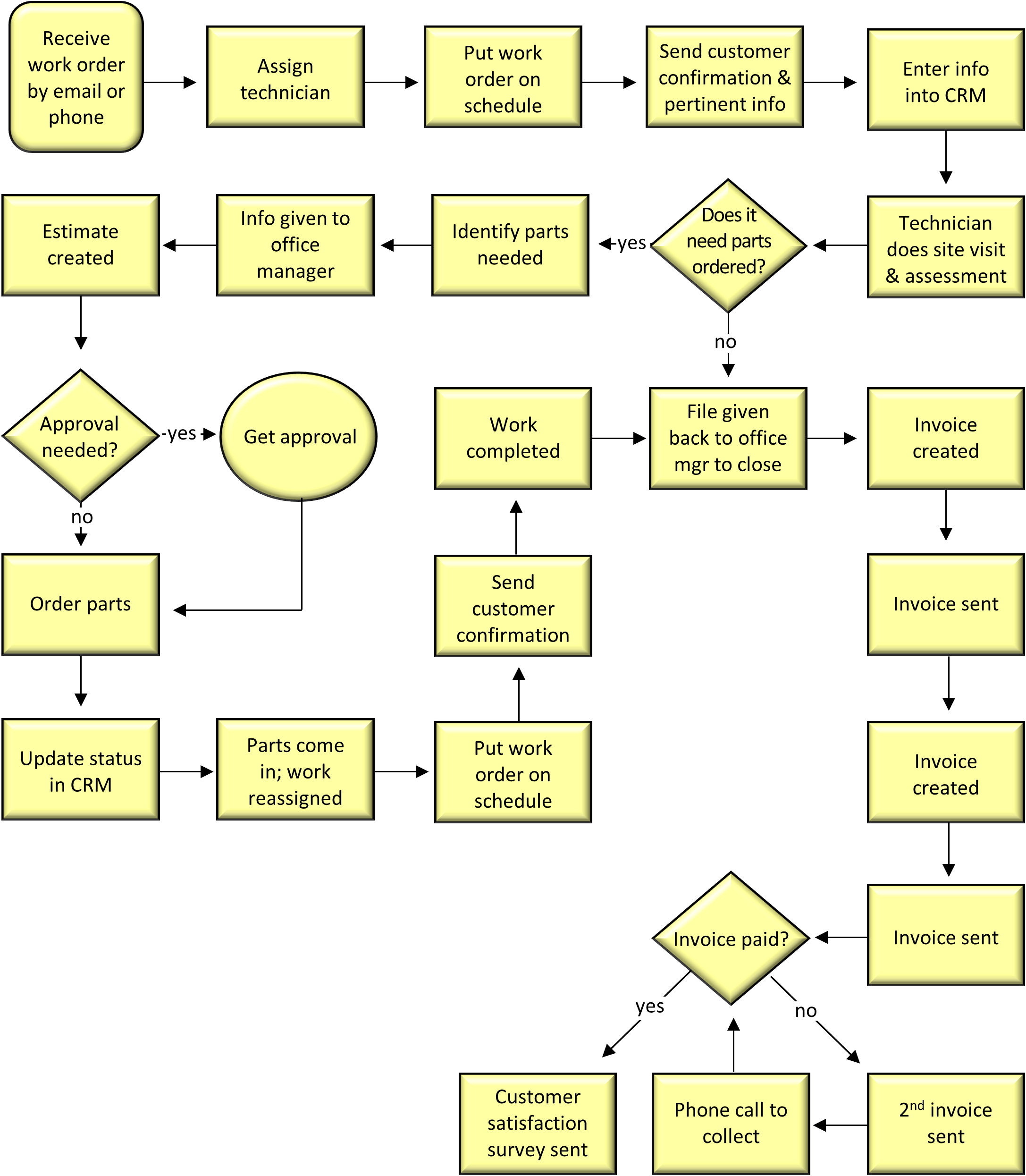 So, formalize that list of steps you made above. Make sure the process includes all of the details someone will need to implement it. A flowchart can be a helpful visual aid. This one is a work order process flowchart showing the steps one needs to take from the moment a work order is received, all the way through doing the job, invoicing and following up with a customer satisfaction survey. Click on the image to expand it.